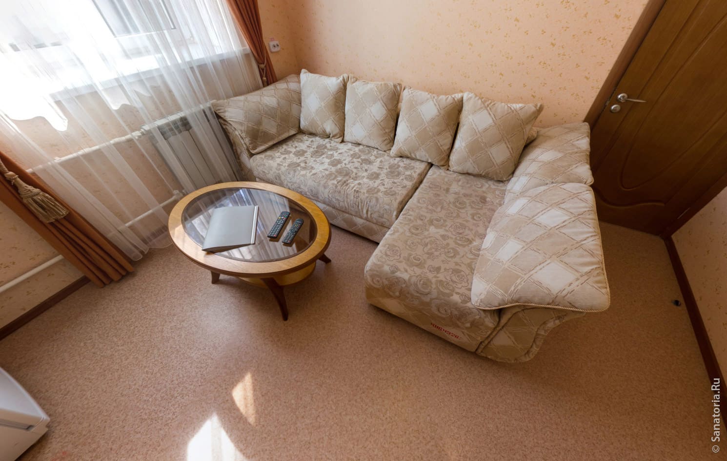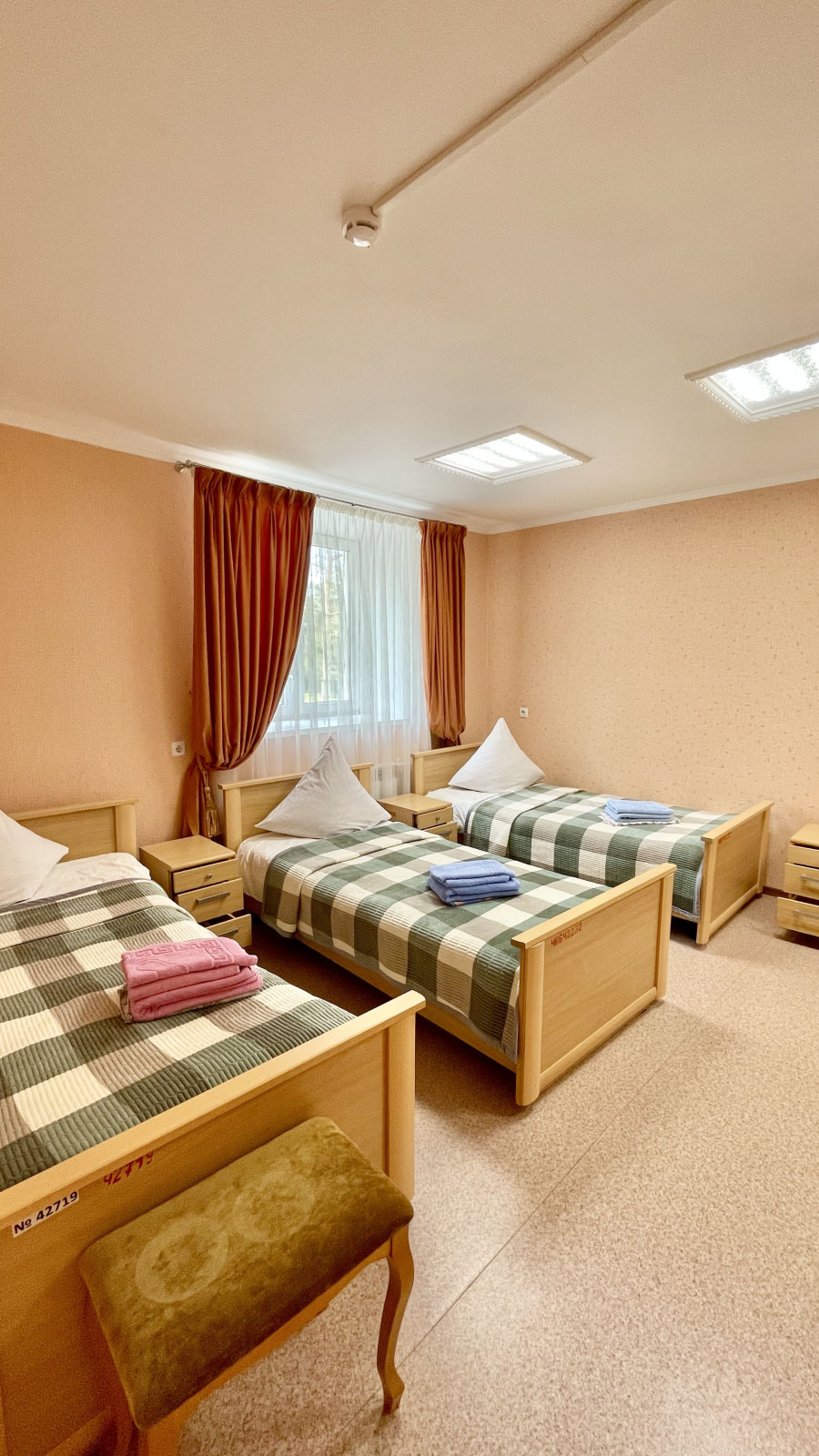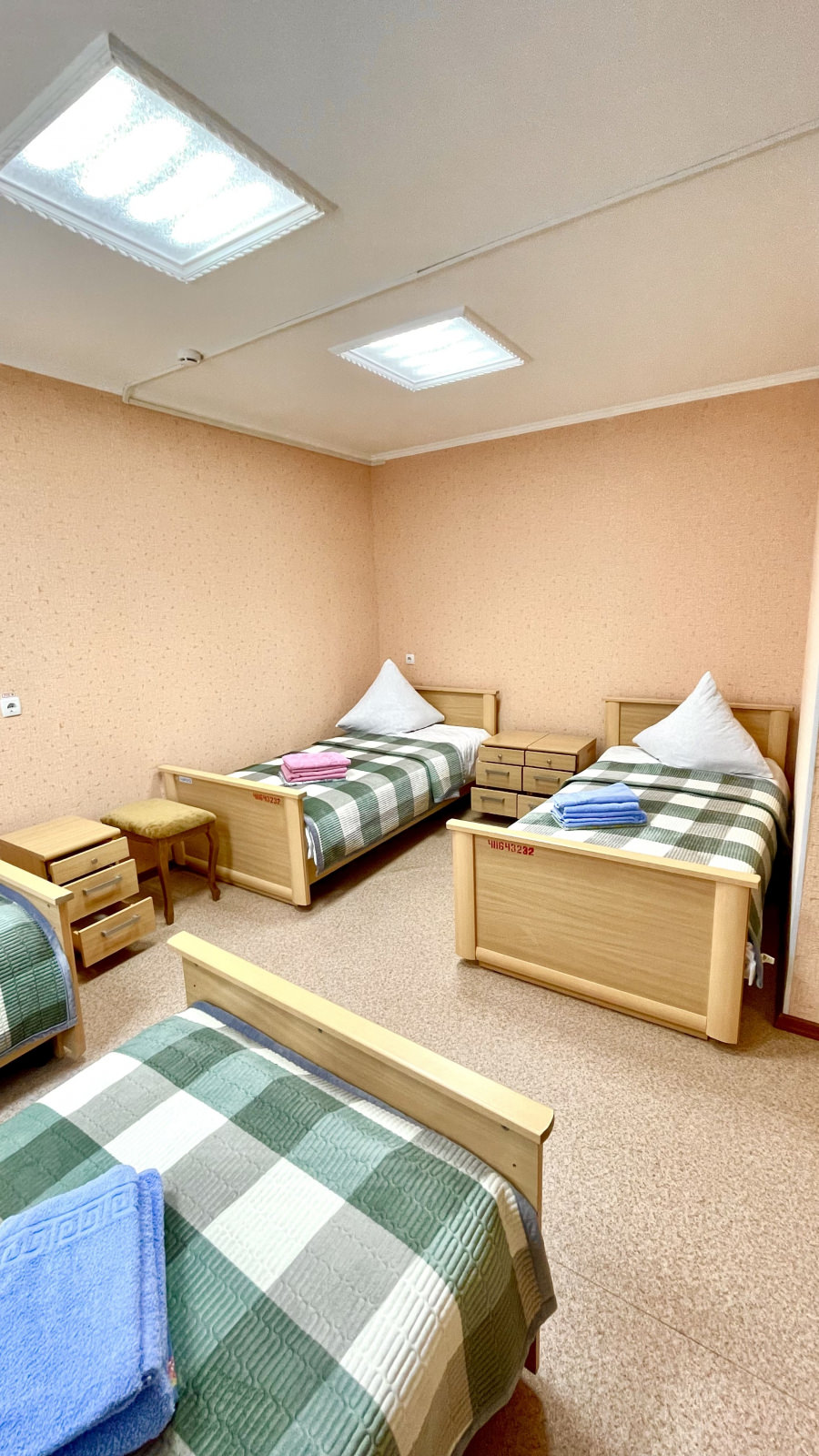 Площадь номера - 29 кв.м. 5 осн. мест. 2 доп. места. Мебель: вешалка, кровати односпальные, прикроватные тумбочки, столик журнальный, стулья, тумба под телевизор, шкаф-купе. Оборудование: кондиционер, мини-холодильник, телевизор ЖК, чайный набор посуды. Санузел на блок. Сервис: смена полотенец, смена постельного белья, уборка номера.