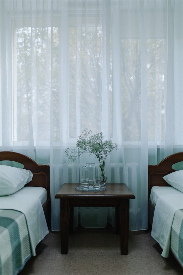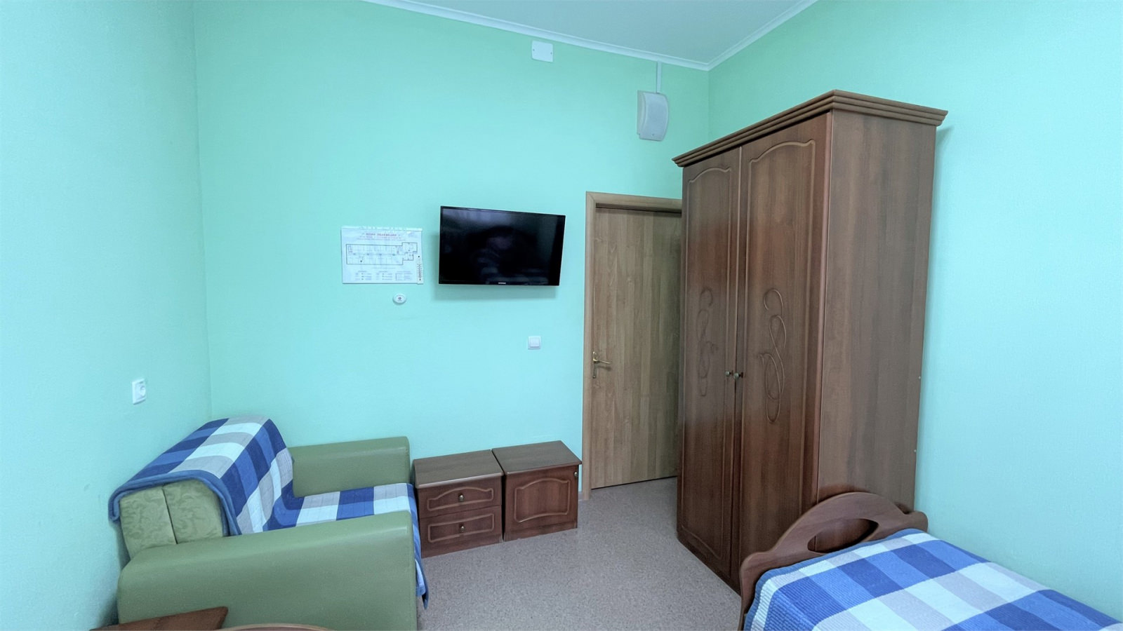 Площадь номера - 17 кв.м. 2 осн. места. 1 доп. место. Мебель: вешалка, кресло-кровать, кровати односпальные, прикроватные тумбочки, стулья, шкаф. Оборудование: мини-холодильник, телевизор ЖК, чайный набор посуды. Санузел. Сервис: смена полотенец, смена постельного белья, уборка номера.