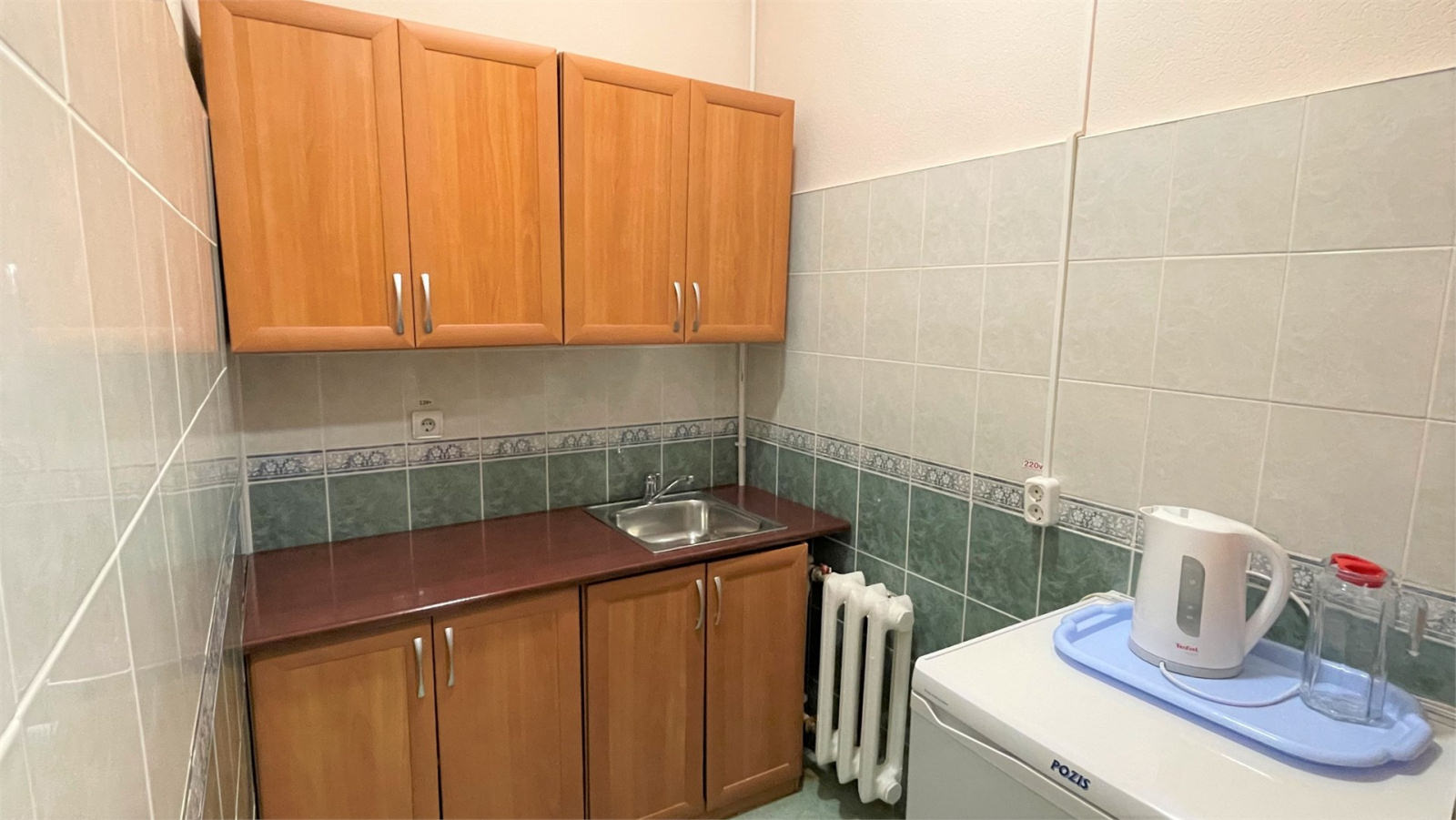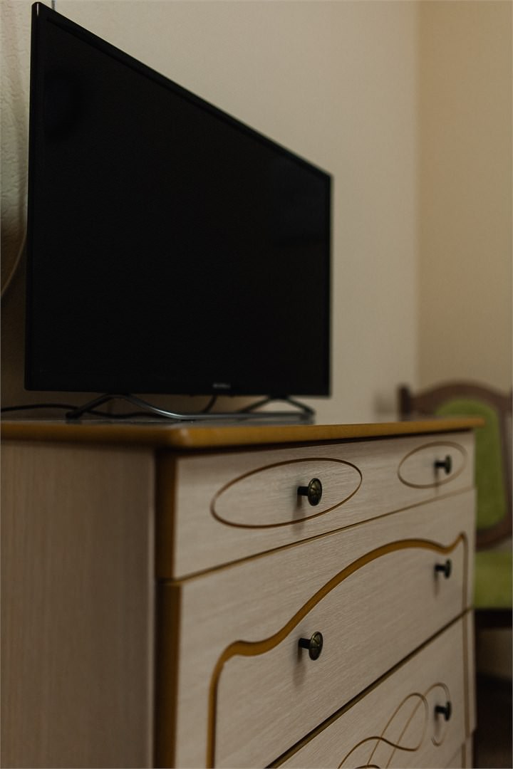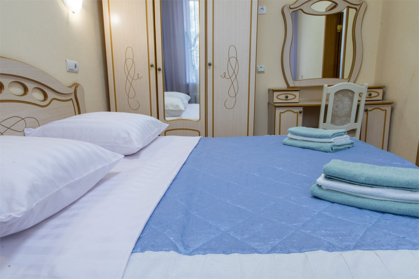 Площадь номера - 17 кв.м. 1 осн. место. 2 доп. места. Мебель: диван, зеркало, кровать двуспальная, прикроватные тумбочки, стол, стулья, шкаф. Мини-кухня. Оборудование: кондиционер, микроволновая печь, мини-холодильник, набор посуды, сейф, телевизор ЖК, чайный набор посуды, электрочайник. Санузел: с душем, тапочки, туалетные принадлежности, фен, халат. Сервис: Wi-Fi бесплатно, смена полотенец, смена постельного белья, уборка номера.